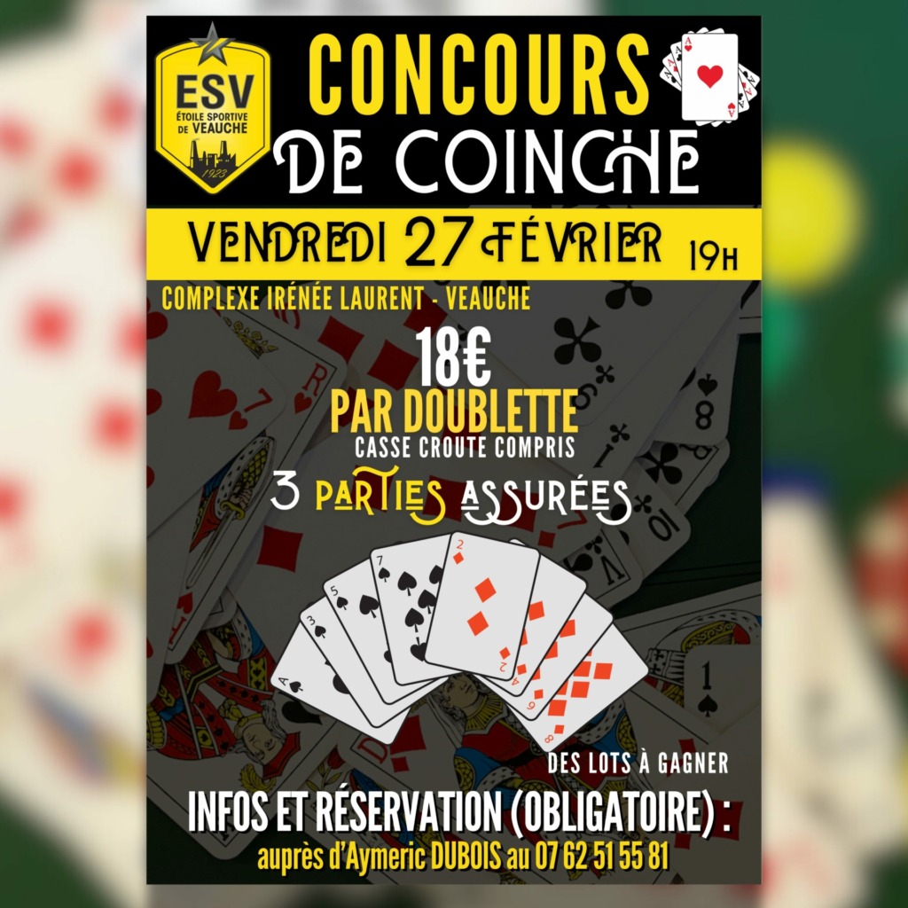 L’ES Veauche organise son traditionnel concours de Coinche le Vendredi 27 février 19h au Complexe Irénée Laurent.