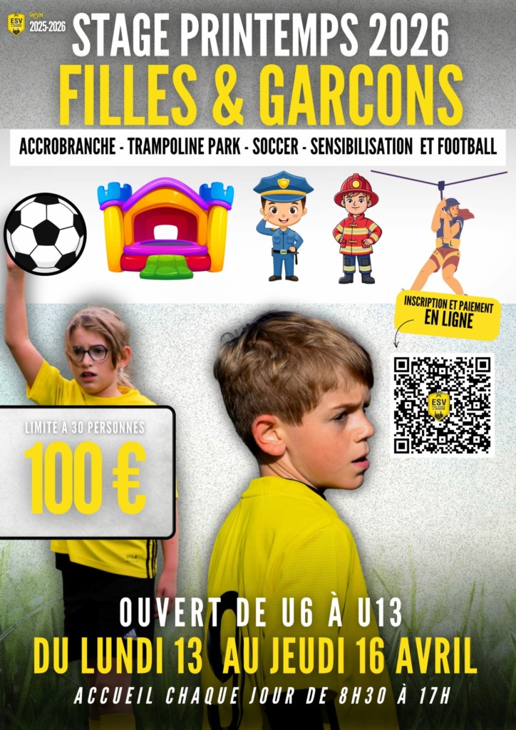 L’Étoile Sportive de Veauche (ESV) organise son stage de printemps 2026 du lundi 13 au jeudi 16 avril !